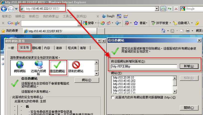 1.請將EF.NET 主機網址的位址 加入信任網站