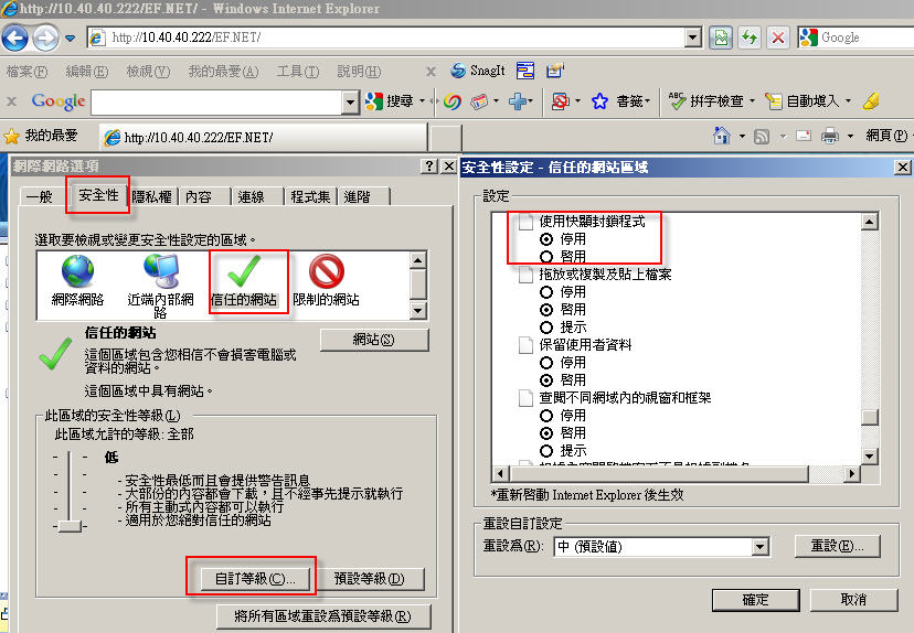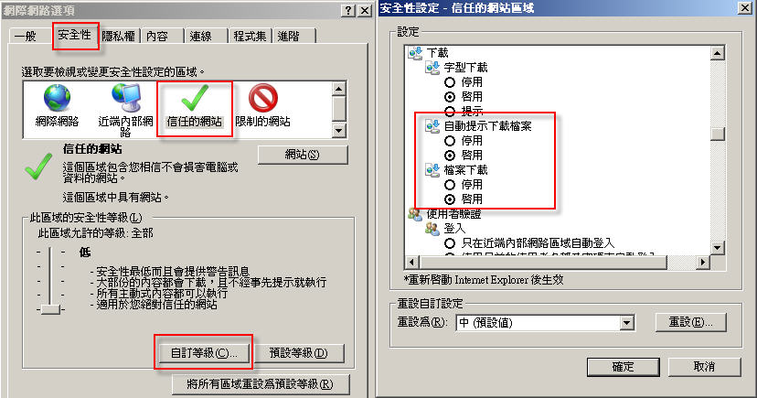 2.設定「信任的網站」自訂等級的安全性設定:
