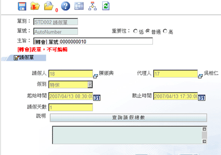 當您有轉會的需要時,您可以選擇轉會功能,首先按下工具列上的”轉會”圖示,系統將會自動為您複製一份新的表單(如右圖)。