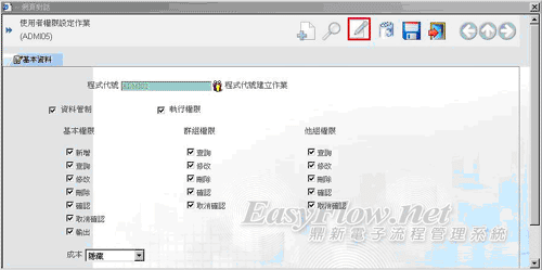 1. 新增指定程式的權限給所有的使用者,畫面如下,請由下拉選單中選定程式代號,再依序選擇給定的各項權限,如:讀取、新增、修改、刪除、列印、報表、擁有等。