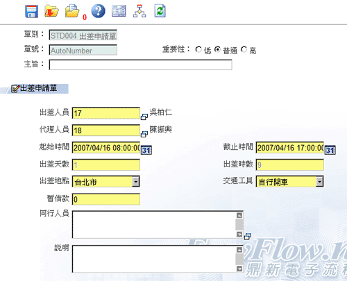 當您必須出差時,可以開啟EasyFlow使用本表單填寫出差申請的相關資訊,如:出差人員、部門、起始及截止出差日期/時間、地點、所使用的交通工具等,將相關資料填好後,按"傳送"就可以將表單傳送給流程定義中相關人員的收件匣中等待簽核;當您收到結案通知,即可得知該出差加班申請是否核准通過。