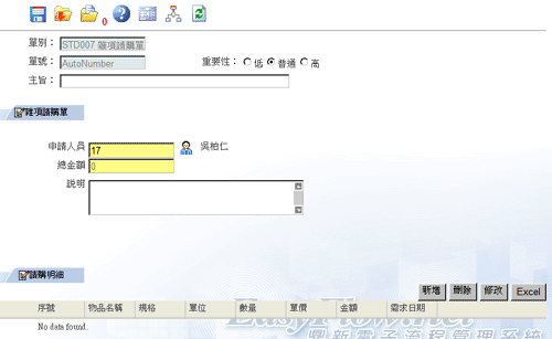 當您需要請購任何物品時,可以開啟EasyFlow使用本表單填寫雜項請購的相關資訊,如:品名、規格、數量、金額等,將相關資料填好後,按"傳送"就可以將表單傳送給流程定義中相關人員的收件匣中等待簽核;當您收到結案通知,即可得知該雜項請購是否核准通過;另外,當本請購單簽核核准通過之後,可以選擇是否直接產生『雜項領用單(STD008)』,繼續雜項領用單的電子表單流程。