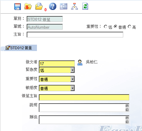當您有文件須要送請簽呈時,可以開啟EasyFlow使用本表單填寫簽呈作業的相關資訊,如:發文者、緊急度、重要性、敏感度、主旨等,將相關資料填妥後,按"傳送"就可以將表單傳送給流程定義中相關人員的收件匣中等待簽核;當您收到結案通知,即可得知該簽呈文件是否核准通過。