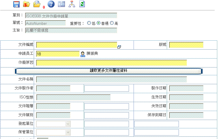 當您欲作廢一份ISO文件,且需要對此文件編號做控管時,填寫本表單,經審核單位審核後,系統會將此文件相關檔案從各發佈主機上回收及將此文件作廢,通知相關人員此文件已作廢。 |