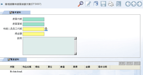 提供一個電子表單資料檔的維護介面,允許足夠權限的使用者查詢請購單的資料;或是在必要的狀況之下(比如後端作業發生錯誤,導致資料庫內的資料內容與實際狀況不符),直接編修表單資料。